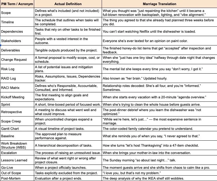 Before I dive in, a quick public service announcement: there’s a Glossary for the Brave Souls Who Married a Project Manager waiting at the bottom. It won’t save you, but it might help you understand what just happened. No change requests will be accepted after reading.